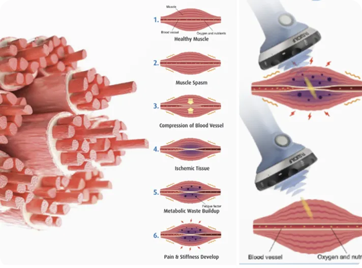 The acoustic pulses gently compress and decompress the tissues. This “micro-stress” stimulates important repair cells like: